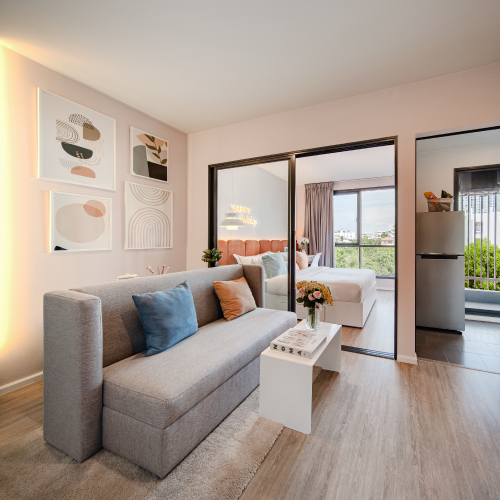 แบบห้องในโครงการมีให้เลือกหลากหลาย ตั้งแต่ขนาด 24.00–35.50 ตร.ม. ทุกห้องมาพร้อม Adaptive Furniture ที่ออกแบบให้ปรับเปลี่ยนตามการใช้งานได้อย่างยืดหยุ่น ไม่ว่าจะอยู่คนเดียวหรืออยู่เป็นคู่ ก็สามารถจัดสรรพื้นที่ใช้สอยให้ลงตัวได้ทุกตารางเมตร — ทั้งทำงาน พักผ่อน และใช้ชีวิตในแบบที่เป็นตัวเอง